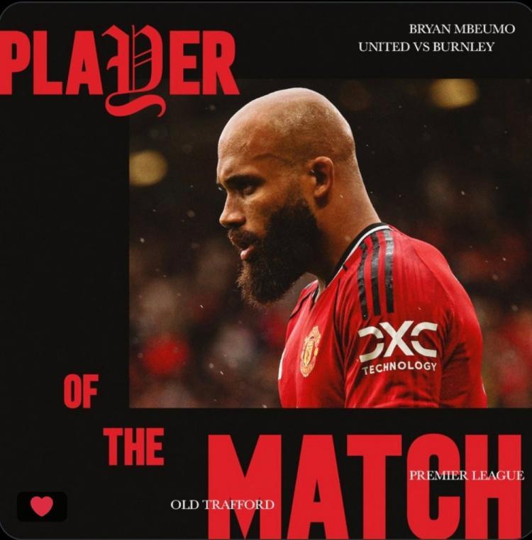 打入曼联生涯首球,官方:姆伯莫当选曼联3-2伯恩利队内最佳球员