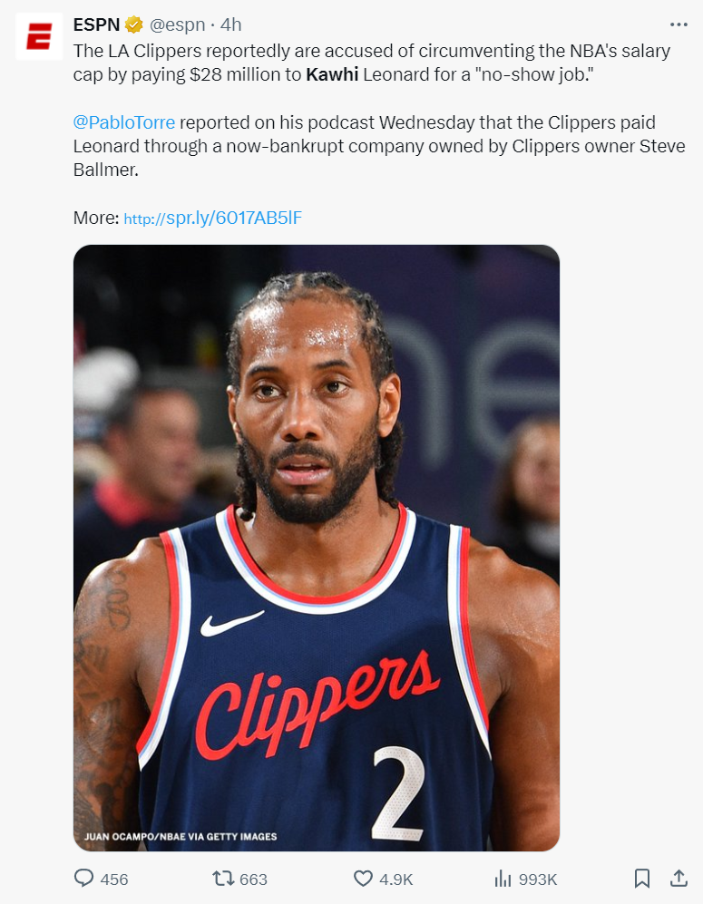 北京时间9月4日,ESPN已经发文报道了,科怀-伦纳德与洛杉矶快船涉嫌签下阴阳合同的事件,TA记者Pablo Torre透露小卡与一家涉嫌欺诈的碳中和(植树)公司存在一份虚假的代言合同,这份合同的代言费高达2800万,而这家公司的注资人是快船老板史蒂夫-鲍尔默。