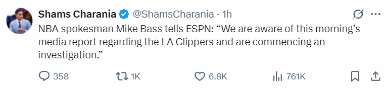ESPN名记Shams已经透露,NBA发言人迈克-巴斯已经表示获悉有关洛杉矶快船的情况,联盟已经开始着手调查。
