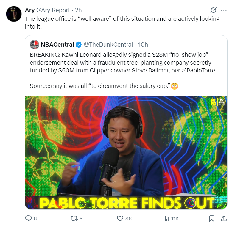 根据美记Ary的报道,联盟办公室是“完全知晓”伦纳德阴阳合同事件,联盟已经开始积极进行调查。