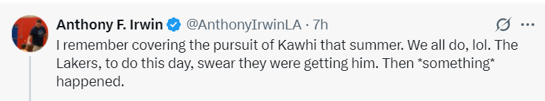 湖人记者安东尼-劳瑞恩:我记得那个夏天报道过湖人追逐科怀的过程。我们大家都记得,哈哈。湖人直到今天都坚称自己当时会拿下他。然后,发生了一些事情。(暗示因为有阴阳合同所以快船才签下了伦纳德)